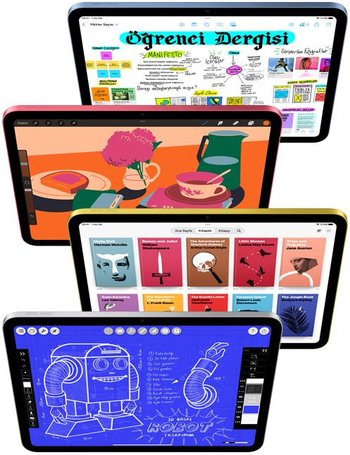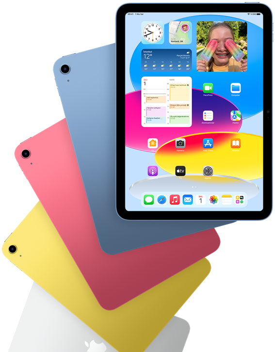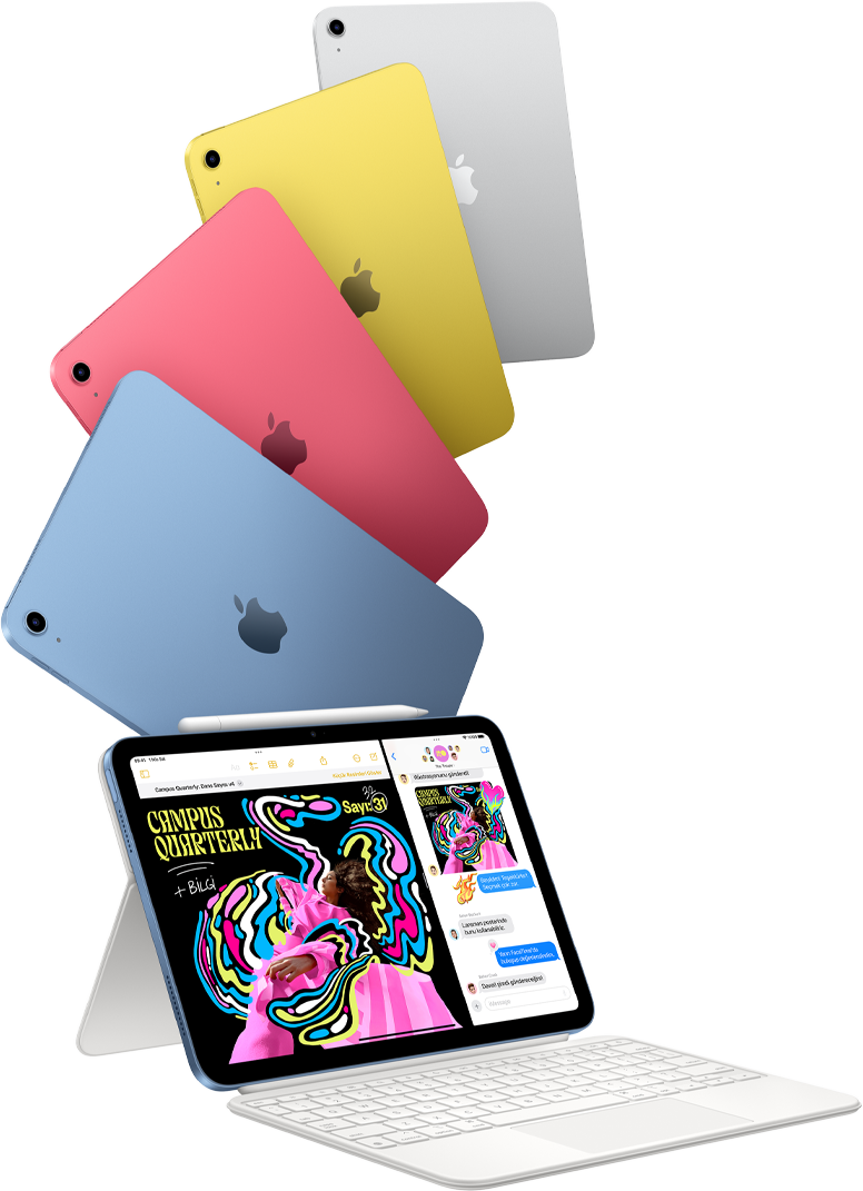 Şimdi A16 çiple süper hız. Öncekinden iki kat fazla, en az 128 GB depolama alanı. Yasal açıklama dipnotuna bakın Renkli tam ekran tasarımıyla 11 inç Liquid Retina ekran. Yasal açıklama dipnotuna bakın Magic Keyboard Folio, Apple Pencil (USB‑C) ve Apple Pencil (1. nesil) desteği.