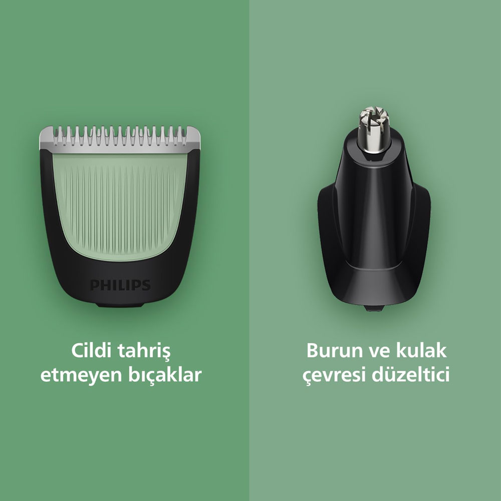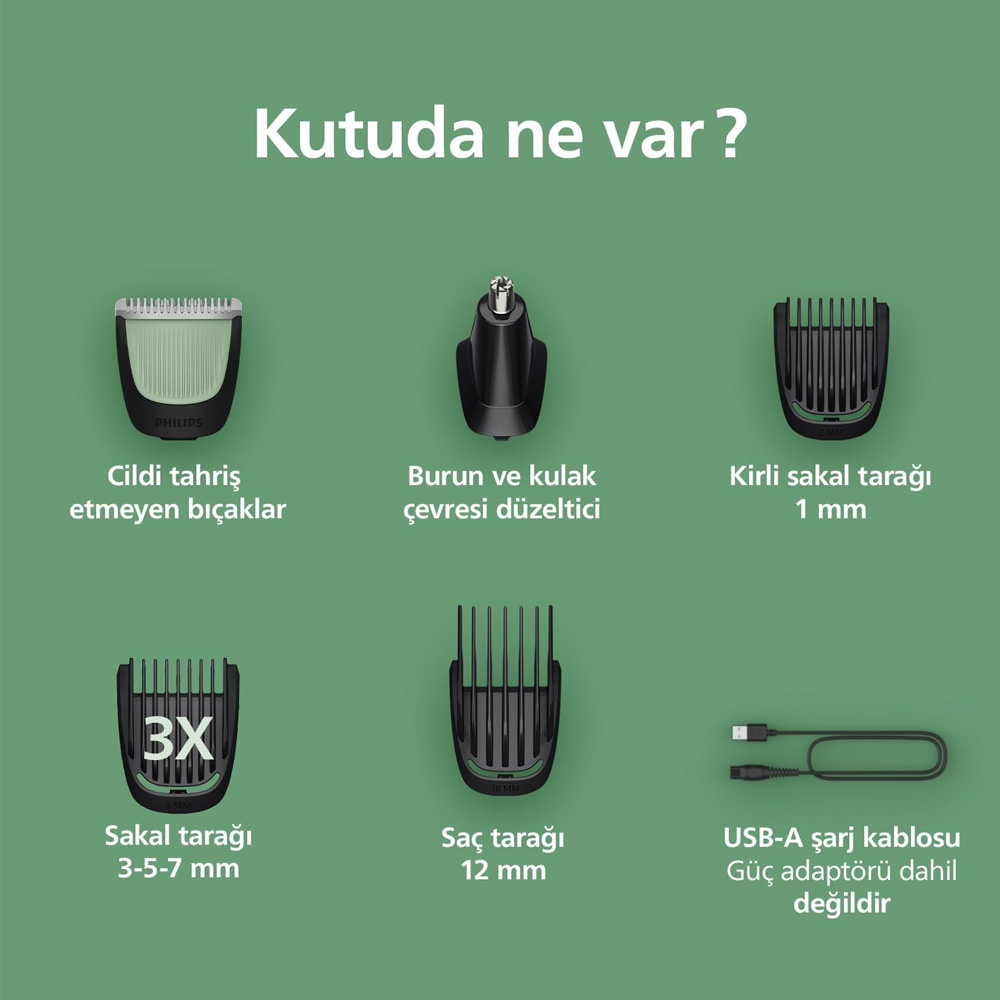 Erkek bakım setimiz, sakalınızı kısaltıp şekillendirmenizi ve saçınızı kısaltmanızı sağlayan 7 farklı başlıkla birlikte gelir; böylece saç ve sakal bakımınızı zahmetsizce tamamlamanızı sağlar.