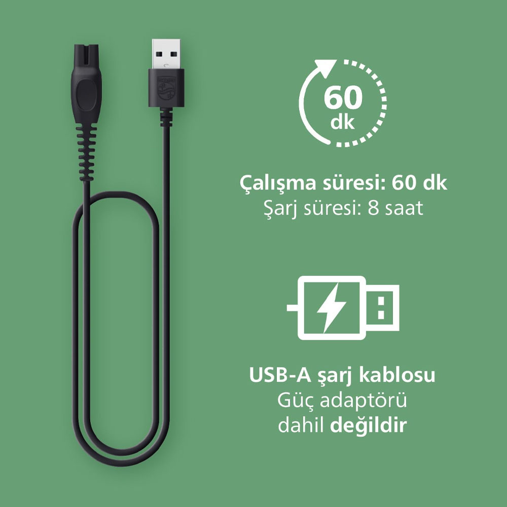 Dayanıklı pili, kesintisiz ve güçlü bir tıraş deneyimi için 60 dakikaya kadar kullanım süresi sunar.