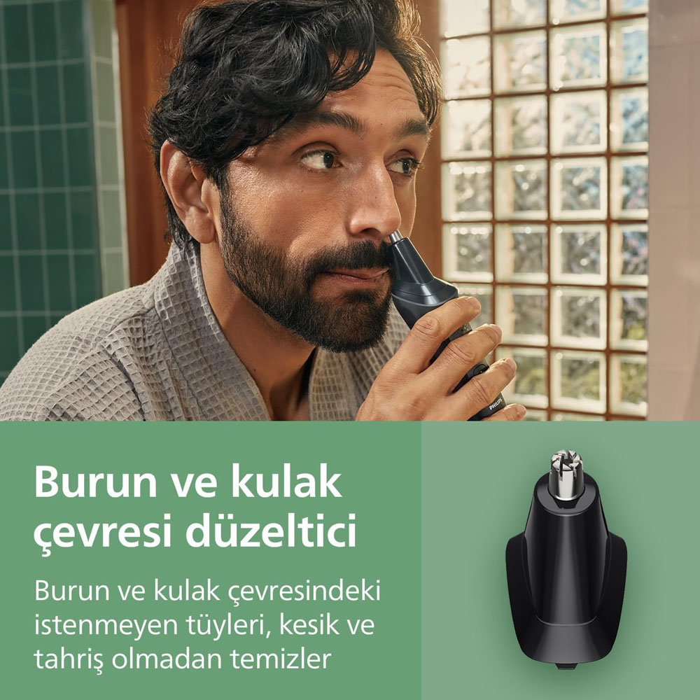 Erkek bakım seti, burun ve kulak çevresindeki istenmeyen tüyleri kesik veya tahrişe neden olmadan kolayca temizlemeniz için tasarlanmıştır.