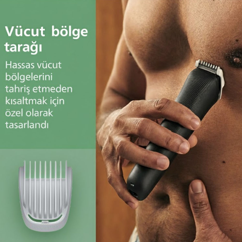 Düzelticinin takılıp çıkarılabilir vücut tarağı, konforlu ve etkili bir tıraş sağlar; böylece vücudunuzu rahat ve güvenle tıraş edebilirsiniz.