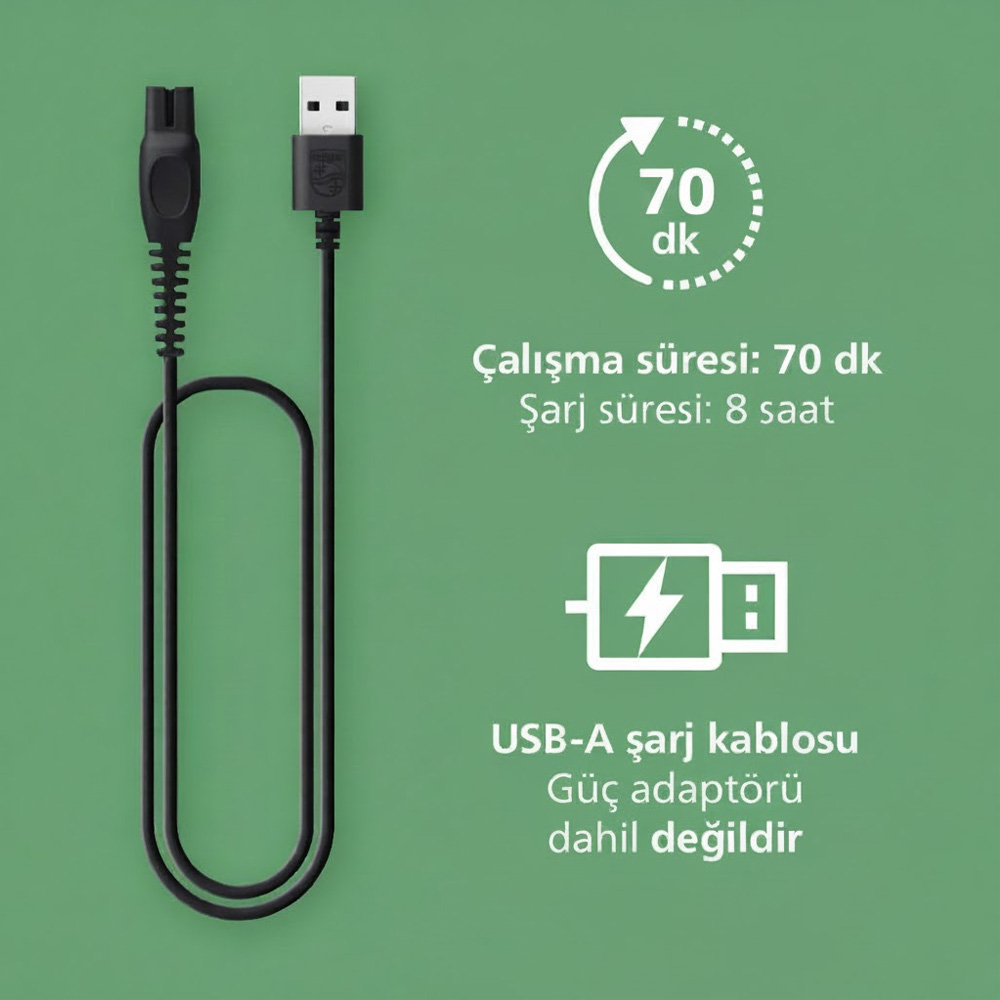 Dayanıklı pili, kesintisiz ve güçlü bir tıraş deneyimi için 70 dakikaya kadar kullanım süresi sunar.