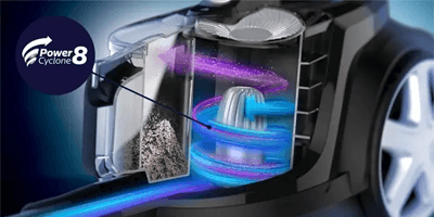 PowerCyclone 8 teknolojisi, hava akışını en üst düzeye çıkarmak ve en yüksek emiş gücünü sağlamak için güçlü bir dönme hareketi gerçekleştirir. Silindirik bölmedeki süper hızlı hava akışı, tozu saatte 185 km'den daha hızlı bir şekilde havadan ayırır ve kusursuz temizlik sonuçları için daha uzun süre daha kuvvetli emiş gücü sağlar.