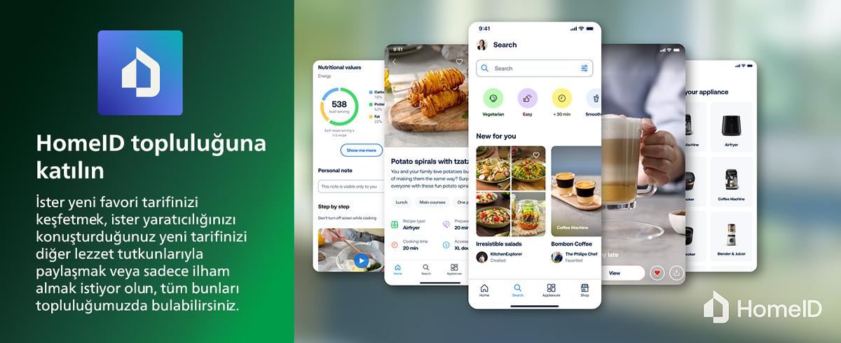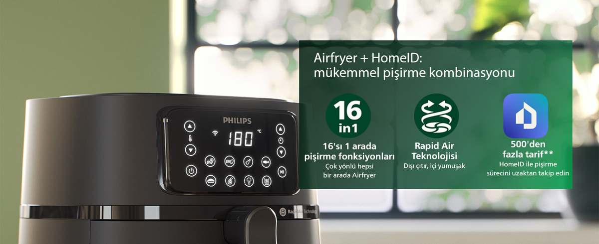 HomeID uygulaması Airfryer'ınıza bağlanarak onu mutfaktaki en önemli yardımcınız haline getirir. Heyecan verici yeni tarifler keşfedip paylaşın ve hatta pişirme sürecini uzaktan izleyin.