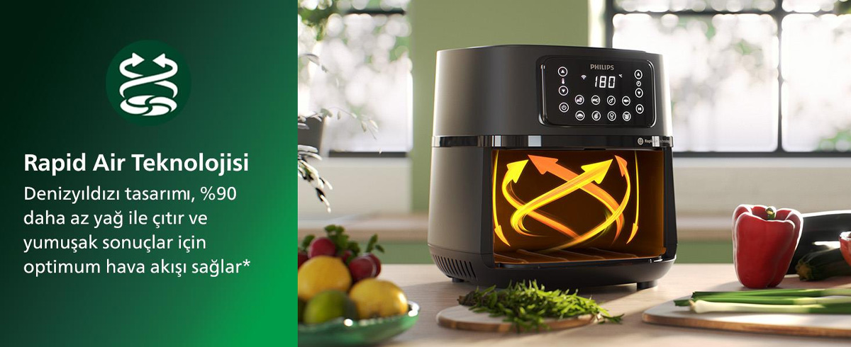 Benzersiz "denizyıldızı" tasarımına sahip Rapid Air Teknolojisi, sıcak havayı döndürerek çok az veya hiç yağ eklemeden dışı çıtır, içi yumuşak lezzetli yemekler pişirir.