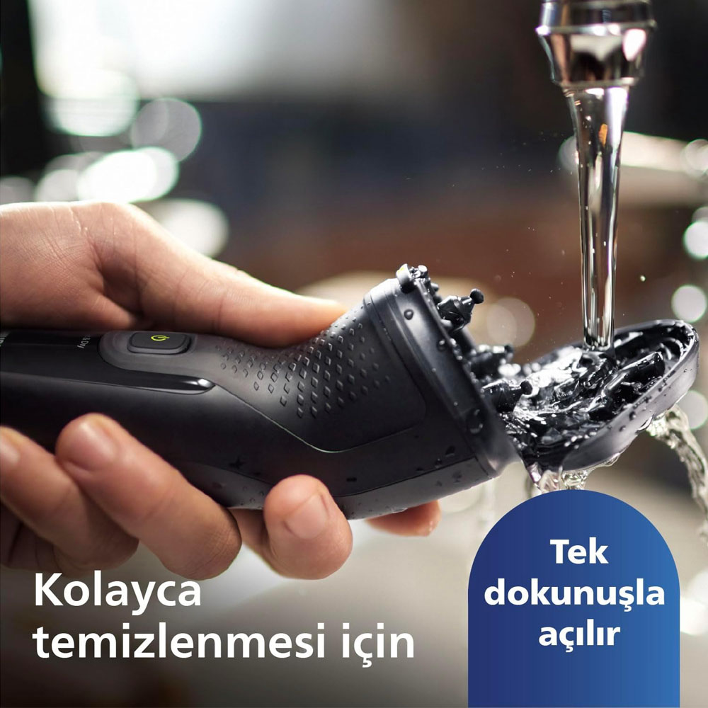 Tıraş makinesinin başlığı, tek dokunuşla kolayca açılır ve suyun altında durulanabilir.