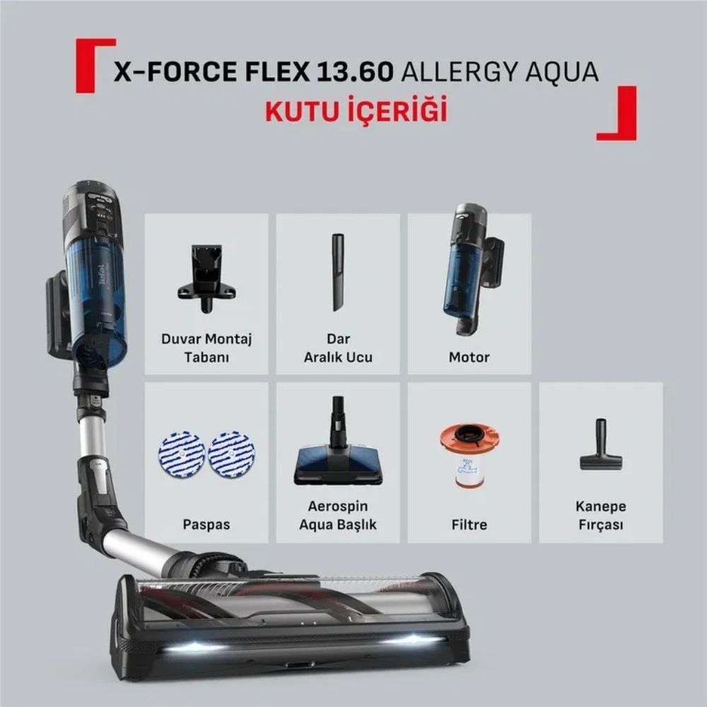 Kutu İçeriği: Dikey elektrikli süpürge, şarj istasyonu, şarj cihazı, dar uçlu başlık, kanepe fırçası, 4 paspaslı Aerospin aktif Aqua Başlık